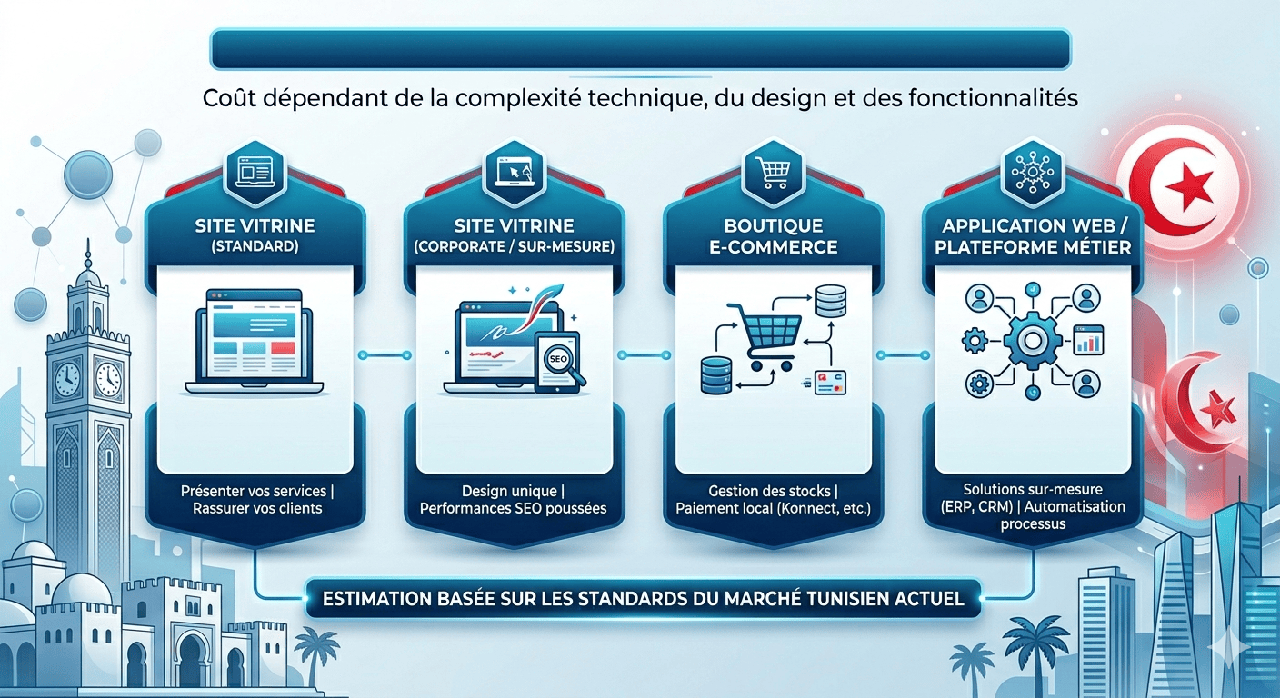 Le coût d’un site web dépend principalement de sa complexité technique, de son design et de ses fonctionnalités. Voici une estimation basée sur les standards du marché tunisien actuel :