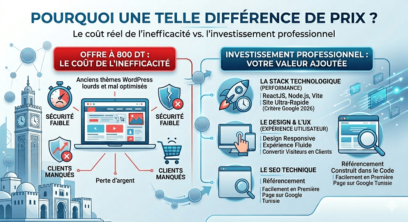 Si vous trouvez des offres à 800 DT, posez-vous la question : quel est le coût réel de l’inefficacité ? Un site lent ou mal sécurisé vous fera perdre plus d’argent en clients manqués qu’il ne vous en fera gagner en économies initiales.